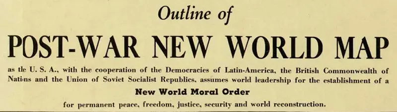 "Zarys powojennej mapy Nowego Świata""My, U.S.A., we współpracy z demokracjami Ameryki Łacińskiej, Brytyjskiej Wspólnoty Narodów i Zjednoczonymi Sowieckimi Socjalistycznymi Republikami, przyjmujemy światowe przywództwo dla ustanowienia Nowego Światowego Moralnego Porządku w celu trwałego pokoju, wolności, sprawiedliwości, bezpieczeństwa i rekonstrukcji świata.