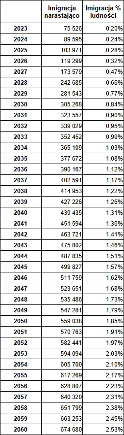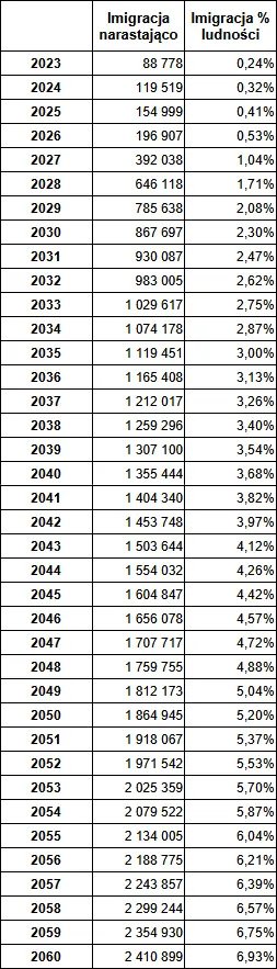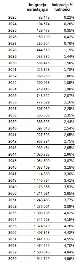Poniższe wykresy ilustrują prognozowaną skalę imigracji oraz zmianę ludności Polski w okresie 2023-2060. Należy pamiętać, że przytoczone dane GUS dotyczą migracji na pobyt stały, czyli nie uwzględniają imigrantów, którzy nie mają tego statusu, np. imigrantów na pobyt czasowy.